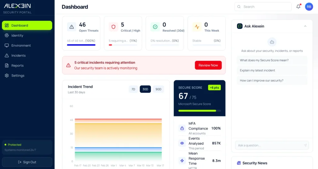 Today, Alexein represents the next evolution of that mission: a purpose-built, Microsoft-native Security Operations Centre (SOC) designed to help organisations get real operational security out of their Microsoft security stack.